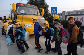 浙江德清縣學(xué)生成為“校車伴我上學(xué)路”的嘗鮮者。11月21日,育才學(xué)校的小學(xué)生們放學(xué)后排隊(duì)前往自己乘坐的校車。據(jù)了解,德清縣設(shè)立了每年400萬的學(xué)生接送營(yíng)運(yùn)補(bǔ)貼專項(xiàng)資金,用于校車公司的運(yùn)行補(bǔ)貼,學(xué)生每人每次乘車只需支付一元錢,貧困學(xué)生免費(fèi)。記者
