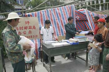 “5·12”地震發(fā)生后,漢中市寧強(qiáng)縣廣坪郵政支局第一時(shí)間搭建起臨時(shí)郵局服務(wù)群眾。 |
