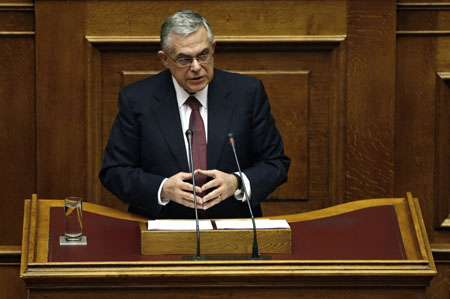 希臘議會7日凌晨通過了旨在擺脫債務(wù)危機的2012年預算案。但一些分析人士擔心,由于希臘民眾對財政緊縮措施的承受能力已近極限,這份預算執(zhí)行起來的難度會非常大。 圖為希臘總理帕帕季莫斯在議會上發(fā)言。