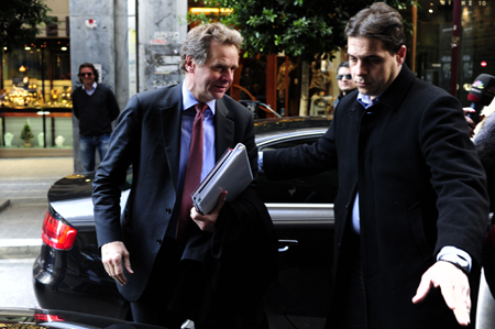 圖為IMF希臘任務(wù)小組主管湯姆森(Poul Thomsen)12日抵達(dá)希臘財(cái)政部。