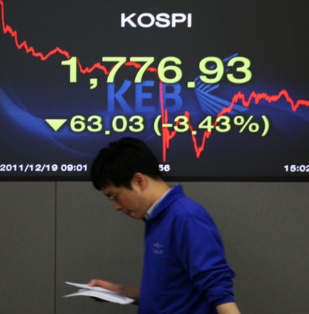 12月19日,在韓國(guó)首爾外匯銀行交易室內(nèi),交易員走過(guò)大屏幕。 當(dāng)日,韓國(guó)股市大跌,收盤時(shí),韓國(guó)首爾股市綜合指數(shù)(KOSPI)下跌63.03點(diǎn),報(bào)收1776.93點(diǎn),跌幅達(dá)3.43%。