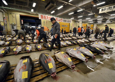 1月5日,在日本東京筑地市場,魚販在新年首個(gè)開市日整理待售的金槍魚。在東京筑地市場一年一度的新年“金槍魚王”拍賣活動(dòng)中,一條重269公斤的藍(lán)鰭金槍魚拍出5649萬日元(約合464萬元人民幣)的創(chuàng)紀(jì)錄高價(jià),相當(dāng)于每公斤21萬日元(約合1.7萬元人民幣)。