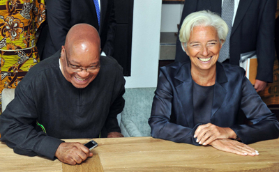 國際貨幣基金組織(IMF)總裁拉加德(右)7日與南非總統(tǒng)祖馬出席南非非洲人國民大會成立100周年紀念慶;顒。拉加德稱贊了南非近年來出色的經(jīng)濟表現(xiàn),但警告說“歐洲債務(wù)危機對非洲最大經(jīng)濟體帶來的風險”。