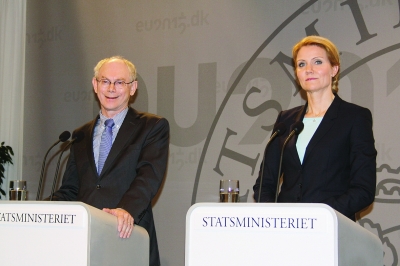 當(dāng)?shù)貢r(shí)間1月9日,歐洲理事會(huì)主席范龍佩(左)與丹麥?zhǔn)紫嗪绽铡ね袑?施密特在哥本哈根舉行會(huì)晤后共同會(huì)見(jiàn)記者。