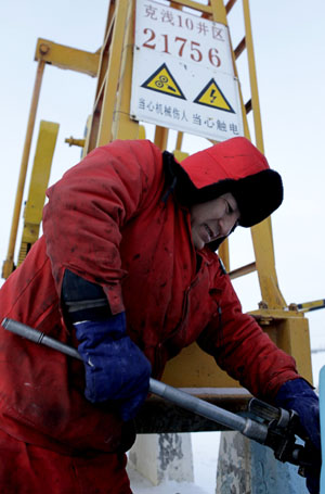 2012年元旦假期后的第一個(gè)工作日,中國(guó)石油克拉瑪依油田職工迎著嚴(yán)寒,冒著風(fēng)雪,巡井、取樣、檢修、安檢,開始為新一年的生產(chǎn)而積極準(zhǔn)備。新華社發(fā)(周建玲/攝) |