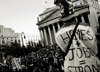 2011年9月17日,“占領(lǐng)華爾街”抗議活動在紐約爆發(fā),聲稱代表99%普通民眾的示威者以紐約祖科蒂公園為大本營,在華爾街附近集會、游行,抗議大公司無節(jié)制的貪婪、指責政府對少數(shù)金融機構(gòu)的救助導(dǎo)致美國民眾陷入經(jīng)濟困境。
