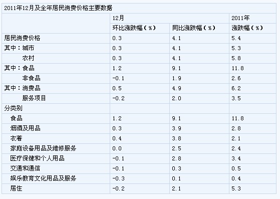 2011年12月份,全國(guó)居民消費(fèi)價(jià)格總水平同比上漲4.1%。其中,城市上漲4.1%,農(nóng)村上漲4.1%;食品價(jià)格上漲9.1%,非食品價(jià)格上漲1.9%;消費(fèi)品價(jià)格上漲4.9%,服務(wù)項(xiàng)目?jī)r(jià)格上漲2.0%。全國(guó)居民消費(fèi)價(jià)格總水平環(huán)比上漲0.3%。其中,城市上漲0.3%,農(nóng)村上漲0.3%;食品價(jià)格上漲1.2%,非食品價(jià)格下降0.1%;消費(fèi)品價(jià)格上漲0.5%,服務(wù)項(xiàng)目?jī)r(jià)格下降0.2%。2011年,全國(guó)居民消費(fèi)價(jià)格總水平比上年上漲5.4%。