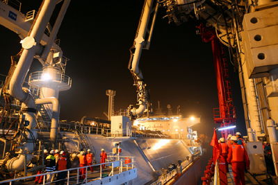 圖為大連LNG夜間卸船。