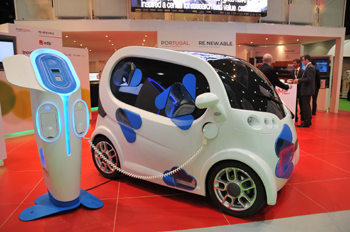 這是1月17日在阿聯(lián)酋首都阿布扎比國家展覽中心拍攝的一家葡萄牙公司推出的電動車。 世界未來能源峰會第四屆年會當(dāng)日在阿聯(lián)酋首都阿布扎比國家展覽中心拉開帷幕。新華社記者