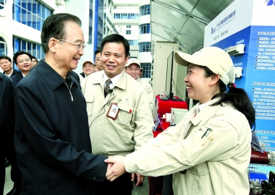 2月3日至4日,國務(wù)院總理溫家寶到廣東省走訪企業(yè)、村莊。這是2月4日,溫家寶考察白云電氣集團(tuán)公司時(shí)與工人親切交談。
