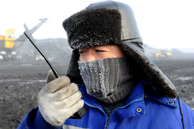 進入1月下旬以來,內(nèi)蒙古呼倫貝爾地區(qū)出現(xiàn)持續(xù)超低溫天氣,最低氣溫達到零下43度,并導(dǎo)致了罕見的“冰霧”現(xiàn)象,給生產(chǎn)和生活造成巨大影響。為保證本地區(qū)電廠和民用煤用戶的煤炭供應(yīng),神華集團神寶能源公司啟動應(yīng)急預(yù)案,確保煤炭生產(chǎn)高位安全運行。圖為煤礦管理人員在現(xiàn)場組織指揮生產(chǎn)。