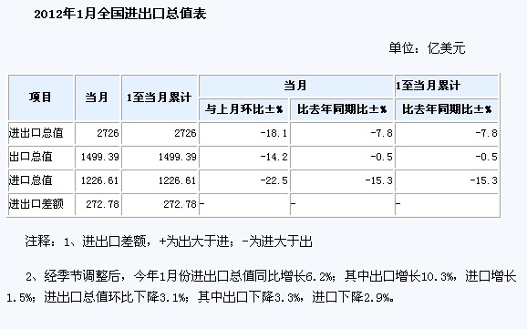 海關總署10日公布今年首月我國外貿進出口情況。據(jù)海關統(tǒng)計,2012年1月份,我國對外貿易進出口總值2726億美元,比去年同期(下同)下降7.8%。其中出口1499.4億美元,下降0.5%;進口1226.6億美元,下降15.3%。貿易順差272.8億美元。
