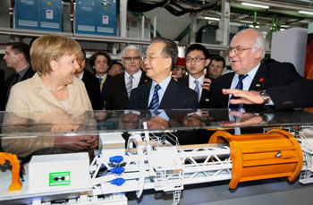 2月3日,正在廣東考察的國(guó)務(wù)院總理溫家寶與德國(guó)總理默克爾在廣州參觀海瑞克(廣州)隧道設(shè)備有限公司。記者 姚大偉 攝 |