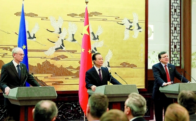 國務(wù)院總理溫家寶14日在人民大會堂與歐洲理事會主席范龍佩、歐盟委員會主席巴羅佐共同主持第十四次中歐領(lǐng)導人會晤。