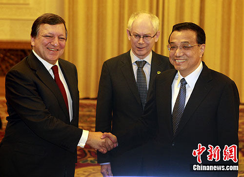2月15日下午,中國國務(wù)院副總理李克強(qiáng)在北京人民大會堂會見歐洲理事會主席范龍佩(中)、歐盟委員會主席巴羅佐(左)。中新社記者