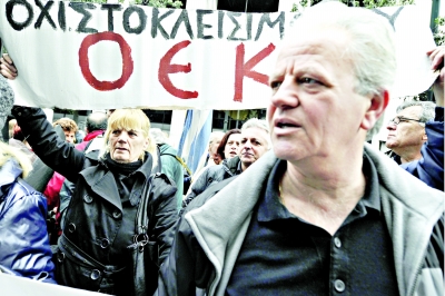 2月16日,被裁減的原國有組織員工在希臘勞工部門口抗議。為早日獲得援助,希臘同意在削減公共職位、工資和養(yǎng)老金的基礎(chǔ)上額外削減3.25億歐元的2012年財政預(yù)算。歐元區(qū)財政部長15日舉行電話會議,要求更加嚴格地監(jiān)督希臘公共支出和財政緊縮措施的執(zhí)行。