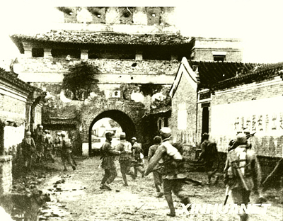 新華社記者黎楓拍攝的1947年9月我軍解放霸州縣的場景,畫面中的建筑為當時霸縣的制高點鼓樓。