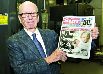 2月25日,在英國(guó)首都倫敦郊外的印刷廠,新聞集團(tuán)董事長(zhǎng)兼首席執(zhí)行官魯珀特·默多克與第一版《星期日太陽(yáng)報(bào)》合影。