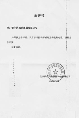 這個(gè)補(bǔ)救辦法就是寫一份《承諾書》。記者拿到了這份印有“北京航信偉業(yè)保溫科技有限公司”公章,由航信偉業(yè)向哈爾濱地鐵集團(tuán)公司出具的《承諾書》,《承諾書》稱:“如果我方中標(biāo)后,我方承諾提供挪威耐克森發(fā)熱電纜,投標(biāo)總價(jià)不變!痹摗冻兄Z書》的落款時(shí)間是2011年10月18日,即中標(biāo)公告發(fā)布前一天。