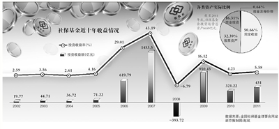 戴相龍昨日在會(huì)議上透露,截至2011年底,社;饡(huì)投資運(yùn)營(yíng)總資產(chǎn)8689億元,其中,直接投資資產(chǎn)為5042億元,占58.03%;委托投資資產(chǎn)為3647億元,占41.97%。到2011年底,各大類資產(chǎn)的實(shí)際比例分別為:固定收益占50.66%,股票資產(chǎn)占32.39%,實(shí)業(yè)投資占16.31%,現(xiàn)金及等價(jià)物占0.64%。 戴相龍稱,2011年基金投資已實(shí)現(xiàn)收益431億元,實(shí)現(xiàn)收益率5.58%。2010年,上證綜指去年整體跌14.31%,社;鹜顿Y收益321億元,投資收益率4.22%。 數(shù)據(jù)顯示,在2001年-2011年的11年里,全國(guó)社;鸸矊(shí)現(xiàn)投資收益2847億元,年均收益率為8.41%,比同期通脹率高出6個(gè)百分點(diǎn)。