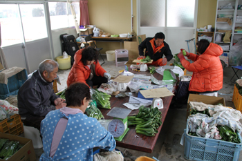 “北釜耕人會(huì)”的災(zāi)民包裝收獲的小松菜。記者 何德功 攝