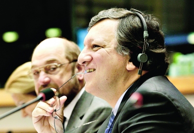 圖為歐盟委員會主席巴羅佐(右)和歐洲議會議長舒爾茨3月22日參加在布魯塞爾舉行的歐洲議會預(yù)算會議。