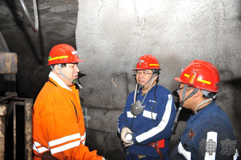 在神東煤炭集團(tuán)公司“找差距、抓整改、促提升”活動中,董事長張子飛(左)深入礦井檢查安全生產(chǎn)。 |