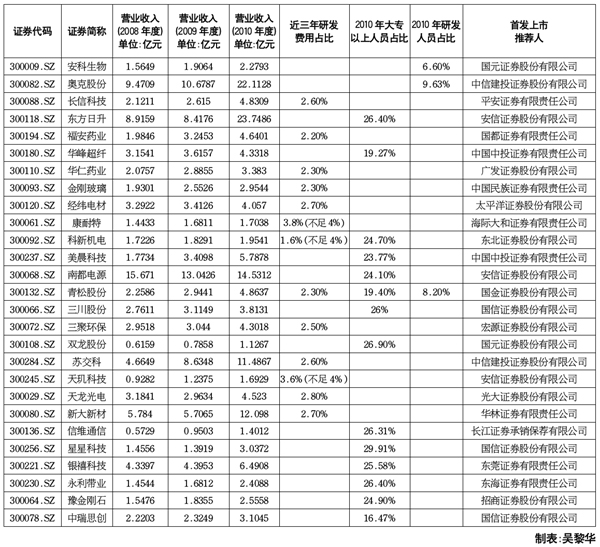 發(fā)布公告的148家公司提交的高新技術(shù)企業(yè)資格復審申請,內(nèi)容包括2008年至2010年研發(fā)費用總額占營業(yè)收入總額情況,2010年研發(fā)人員占比、大專以上學歷占比情況等數(shù)據(jù)。然而,《經(jīng)濟參考報》記者統(tǒng)計上述公司2010年年報發(fā)現(xiàn),在這148家通過高新技術(shù)企業(yè)資格復審的創(chuàng)業(yè)板企業(yè)中,“魚目混珠”者不在少數(shù),加上1家首次獲得國家火炬計劃重點高新技術(shù)企業(yè)的公司,研發(fā)費用總額占營業(yè)收入總額不達標的有13家,大專以上員工占比不足30%的有14家,研發(fā)人員占比不足10%的有3家。