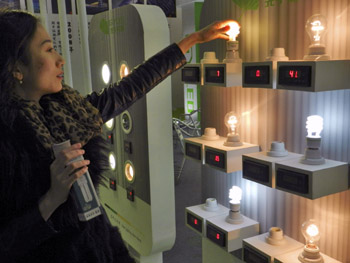 觀眾在2012中國(guó)(北京)國(guó)際照明展覽會(huì)上體驗(yàn)節(jié)能燈與普通燈的區(qū)別。新華社發(fā) |