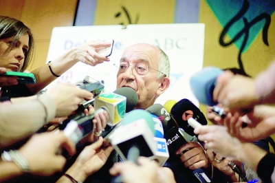 據(jù)外媒報道,西班牙央行行長奧德內(nèi)茲(Miguel Angel Fernandez Ordonez)周二(4月10日)在馬德里的一場會議上說:“如果西班牙經(jīng)濟比預(yù)期更為惡化,繼續(xù)給銀行增加資本金將是必要的”。他表示,西班牙經(jīng)濟不可能在短期內(nèi)強勁反彈。相關(guān)報道稱,西班牙經(jīng)濟今年正在走入衰退,政府預(yù)計經(jīng)濟將萎縮1.7%。 圖為奧德內(nèi)茲在接受媒體采訪。