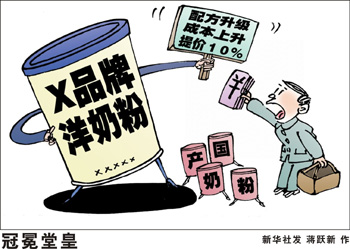 “一罐奶粉的成本不會超過100元,可是國內(nèi)市場上‘洋奶粉’的零售價(jià)動輒三四百元,比境外貴一兩倍;還有一些打著‘洋奶粉’旗號的中國特供奶,價(jià)格也高得離譜,對消費(fèi)者產(chǎn)生一定的誤導(dǎo)性。”一位專家抱怨,“洋奶粉”暴利已經(jīng)到了讓人難以置信的地步,但消費(fèi)者對其肆無忌憚的連續(xù)漲價(jià)卻束手無策。 《經(jīng)濟(jì)參考報(bào)》記者了解到,進(jìn)口奶粉量價(jià)齊增,一方面是需求增加,另一方面則是行業(yè)的暴利驅(qū)使更多企業(yè)進(jìn)口奶粉。值得關(guān)注的是,進(jìn)口奶粉與國產(chǎn)奶粉的競爭正在向中低端延伸。以前,進(jìn)口奶粉主攻高端市場,現(xiàn)在各種中小品牌和雜牌“洋奶粉”也蜂擁而至,向中低端市場挺進(jìn),直接蠶食傳統(tǒng)的國產(chǎn)奶粉市場。