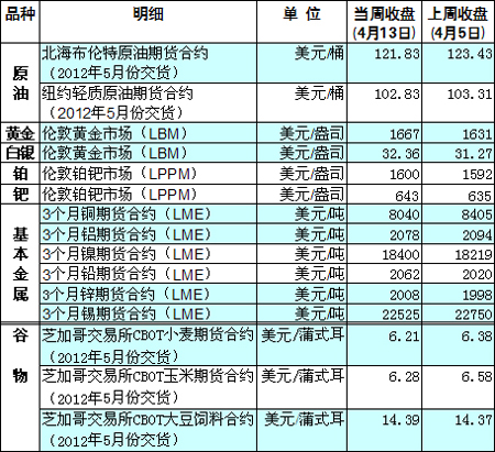 在美國就業(yè)數(shù)據(jù)不佳、中國經(jīng)濟(jì)增速放緩以及歐洲債務(wù)危機(jī)重返市場等多重因素作用下,本周投資者對全球經(jīng)濟(jì)放緩的擔(dān)憂增加,國際大宗商品價(jià)格漲跌互現(xiàn)。 13日歐元承壓下跌,對美元匯率降0.8%以上。美元隨之上漲,強(qiáng)勢美元對以美元計(jì)價(jià)的大宗商品價(jià)格造成打壓。 到13日收盤時(shí),紐約商品交易所5月交貨的輕質(zhì)原油期貨價(jià)格收于每桶102.83美元;全周來看,紐約油價(jià)微跌48美分,跌幅為0.46%。倫敦洲際交易所(ICE)5月交貨的倫敦北海布倫特原油期貨價(jià)格收于每桶121.83美元,全周跌幅1.3%。 有觀點(diǎn)認(rèn)為,由于需求減弱以及全球經(jīng)濟(jì)放緩擔(dān)憂加劇,未來數(shù)周倫敦油價(jià)可能將回落至每桶115美元。但油價(jià)依然會從伊朗和西方國家的緊張關(guān)系中獲得支持。伊朗將于14日與美英等六個(gè)國家重啟核談判。但伊朗和美國可能均缺乏誠意。 紐約金價(jià)本周上漲1.8%。由于全球經(jīng)濟(jì)不確定性導(dǎo)致市場避險(xiǎn)情緒蔓延,黃金期貨價(jià)格本周初一路上漲,但中國第一季度經(jīng)濟(jì)增長弱于預(yù)期導(dǎo)致紐約黃金期價(jià)13日大幅下跌,紐約商品交易所黃金期貨市場交投最活躍的6月合約收于每盎司1660.2美元。13日,5月份交貨的白銀期貨價(jià)格收于每盎司32.525美元,全周漲幅為2.5%;7月份交貨的白金期貨價(jià)格收于每盎司1587.9美元,全周漲幅為5.3%。