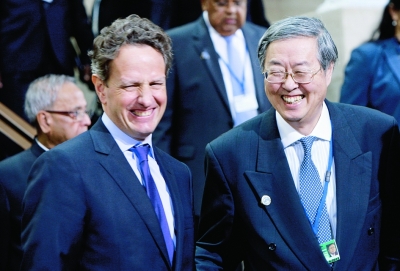 二十國集團(tuán)(G20)財(cái)長和央行行長20日在華盛頓重點(diǎn)就國際貨幣基金組織(IMF)增資與改革問題進(jìn)行了討論。中方在發(fā)言中指出,相信歐洲完全有智慧、有能力妥善應(yīng)對(duì)歐債危機(jī),中國對(duì)歐元區(qū)的經(jīng)濟(jì)金融穩(wěn)定有信心。對(duì)于國際社會(huì)在共識(shí)的基礎(chǔ)上向IMF增加資源,中國不會(huì)缺席。IMF增加資源應(yīng)主要以份額為基礎(chǔ)。希望IMF敦促各國盡快完成2010年份額改革方案的審批程序,確保在今年10月IMF年會(huì)前按時(shí)完成。圖為,21日,在美國華盛頓,中國人民銀行行長周小川(右)與美國財(cái)長蓋特納在等待合影前交談。