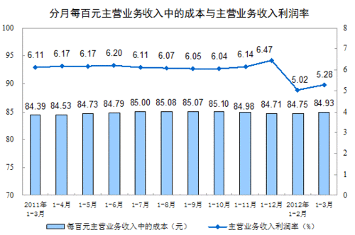 圖為分月每百元主營(yíng)業(yè)務(wù)收入中的成本與主營(yíng)業(yè)務(wù)收入利潤(rùn)率示意圖
