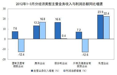 圖為前3月分經(jīng)濟(jì)類(lèi)型主營(yíng)業(yè)務(wù)收入與利潤(rùn)總額同比增速示意圖