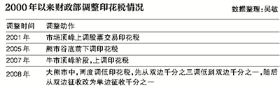 新世紀(jì)以來(lái),財(cái)政部在2001年市場(chǎng)頂峰上調(diào)股票交易印花稅;又在2005年熊市谷底前下調(diào)印花稅,再次上調(diào)則到了2007年牛市頂峰階段;隨后在2008年大熊市中兩度調(diào)低印花稅,先從雙邊千分之三調(diào)低到雙邊千分之一,隨后從雙邊征收改為單邊征收千分之一。