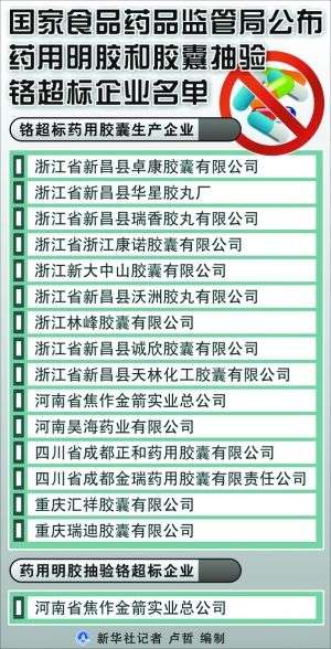 據(jù)國家食品藥品監(jiān)督管理局網(wǎng)站消息,按照企業(yè)全覆蓋、品種全覆蓋、產(chǎn)品批次隨機(jī)抽樣的原則,國家食品藥品監(jiān)管局在全國范圍內(nèi)對藥用明膠和膠囊生產(chǎn)企業(yè)進(jìn)行了全面排查,對18家藥用明膠生產(chǎn)企業(yè)抽驗(yàn)了166批明膠,檢出1批產(chǎn)品鉻超標(biāo);對117家藥用膠囊生產(chǎn)企業(yè)抽驗(yàn)了941批藥用膠囊,檢出15家企業(yè)74批膠囊鉻超標(biāo),不合格率為7.9%。