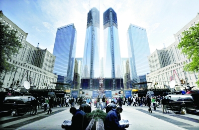 4月30日,人們從正在建設(shè)的紐約世貿(mào)中心1號(hào)樓(中右)下經(jīng)過,旁邊高樓的玻璃幕墻反映出世貿(mào)中心1號(hào)樓的影像(中左)。