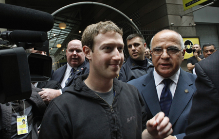 美國著名社交網(wǎng)站“臉譜”公司(Facebook)當(dāng)?shù)貢r間7日在紐約正式開始路演。根據(jù)首次公開募股(IPO)定價,“臉譜”計(jì)劃募集最多118億美元,這將超過以往任何一家互聯(lián)網(wǎng)公司的IPO規(guī)模。 圖為“臉譜”公司首席執(zhí)行官馬克·扎克伯格當(dāng)日在安全人員的護(hù)衛(wèi)下離開進(jìn)行宣傳活動的美國紐約市喜來登酒店。