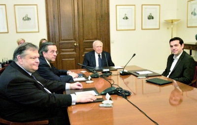 5月13日,希臘總統(tǒng)卡羅洛斯·帕普利亞斯(右二)在雅典會(huì)見泛希社運(yùn)領(lǐng)導(dǎo)人埃萬耶洛斯·韋尼澤洛斯(左一)、新民主黨領(lǐng)導(dǎo)人安東尼斯·薩馬拉斯(左二)和左翼激進(jìn)聯(lián)盟黨領(lǐng)導(dǎo)人亞歷克西斯·齊普拉斯(右一)。 希臘議會(huì)第三大政黨泛希臘社會(huì)主義運(yùn)動(dòng)、即泛希社運(yùn)12日交還總統(tǒng)帕普利亞斯的授權(quán),放棄組閣嘗試。帕普利亞斯于13日中午召集所有政黨領(lǐng)導(dǎo)人,以求就組閣達(dá)成一致。據(jù)外媒報(bào)道,薩馬拉斯稱,左翼激進(jìn)聯(lián)盟黨反對(duì)組建聯(lián)合政府,重新選舉難以避免。新華社發(fā)