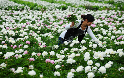 中江白芍系多年生草本藥用植物,人工栽培有300年的歷史。當(dāng)?shù)卣畬?shí)行“公司+農(nóng)戶+市場(chǎng)”和“公司+業(yè)主(大戶)”的運(yùn)行模式,除了培育壯大了一批醫(yī)藥企業(yè),還不斷擴(kuò)大白芍種植面積,配套旅游基礎(chǔ)設(shè)施,依托萬(wàn)畝芍藥地大力發(fā)展以白芍為特色的中醫(yī)藥養(yǎng)生旅游經(jīng)濟(jì),目前,全國(guó)各地眾多游客慕名而來(lái)。四川省中江縣集鳳鎮(zhèn)石埡,一位來(lái)自成都的游客在芍藥地里采摘芍藥花。