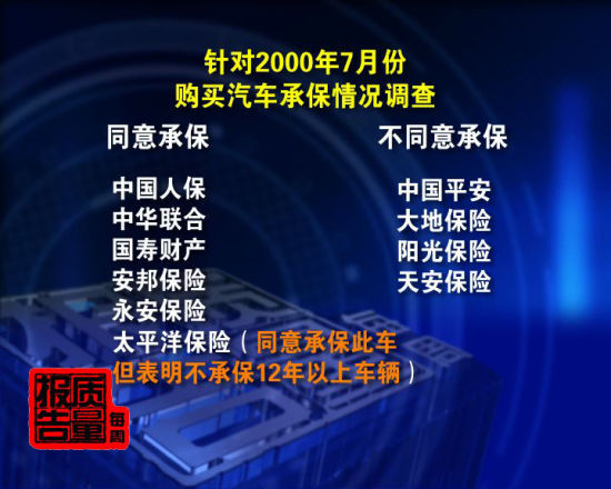事實(shí)真的如此嗎?記者在江蘇對(duì)2011年我國(guó)財(cái)產(chǎn)險(xiǎn)公司中,業(yè)務(wù)收入排名前十位的保險(xiǎn)公司進(jìn)行了調(diào)查。結(jié)果,針對(duì)這輛2000年7月購(gòu)買的小汽車,五家保險(xiǎn)公司同意對(duì)承保車損險(xiǎn),其中包括中國(guó)人保,中華聯(lián)合,國(guó)壽財(cái)產(chǎn),安邦保險(xiǎn)和永安保險(xiǎn)。太平洋保險(xiǎn)表示可對(duì)此車承保,但不承保車齡在12年以上的車輛。其余四家保險(xiǎn)公司不同意承保,包括中國(guó)平安,大地保險(xiǎn),陽(yáng)光保險(xiǎn)和天安保險(xiǎn)。