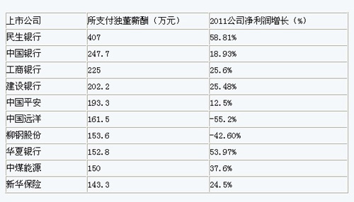 2011年,2283家上市公司共支付的獨董薪酬共4.50億元,其中最慷慨的上市公司為民生銀行,2011年獨董薪酬支出金額高達407萬元,排名前十的上市公司依次是,中國銀行(237萬)、工商銀行(225萬)、建設銀行(202萬),中國平安(193萬元),中國遠洋(161萬元)、柳鋼股份(153萬元)、華夏銀行(152萬元),中煤能源(150萬元)、新華保險(143萬元)。