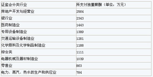 依據(jù)證監(jiān)會(huì)分類,房地產(chǎn)開(kāi)發(fā)與經(jīng)營(yíng)業(yè)成為最慷慨的行業(yè),2011年,它給獨(dú)立董事們總共支付了2564萬(wàn)元;第二名才是銀行業(yè),去年支付了2343萬(wàn)元;第三名為醫(yī)藥制造業(yè),支付了1443萬(wàn)元,后面依次才是專用設(shè)備制造業(yè)、交通運(yùn)輸設(shè)備制造業(yè)、化學(xué)、電器、零售業(yè)、電力等行業(yè)。