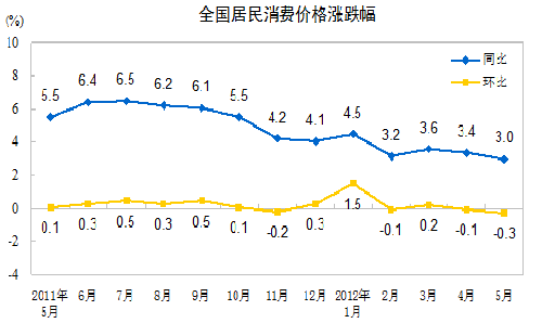 2012年5月份,全國(guó)居民消費(fèi)價(jià)格總水平同比上漲3.0%。其中,城市上漲3.0%,農(nóng)村上漲2.9%;食品價(jià)格上漲6.4%,非食品價(jià)格上漲1.4%;消費(fèi)品價(jià)格上漲3.6%,服務(wù)項(xiàng)目?jī)r(jià)格上漲1.7%。1-5月平均,全國(guó)居民消費(fèi)價(jià)格總水平比去年同期上漲3.5%。