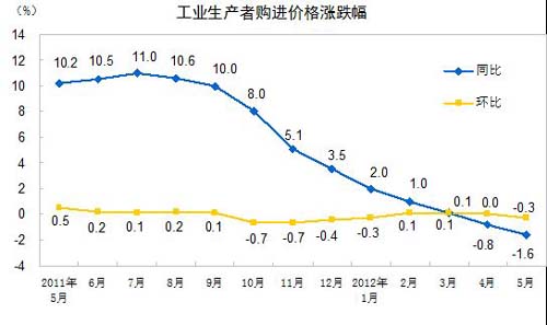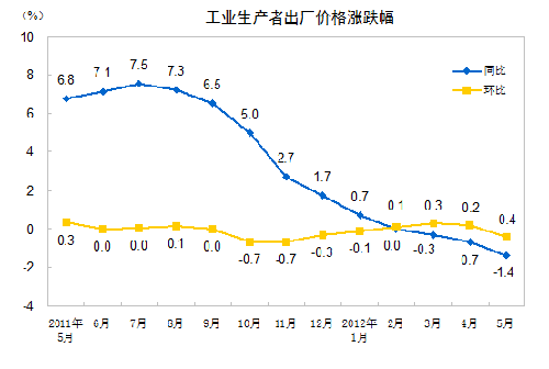 2012年5月份,全國工業(yè)生產(chǎn)者出廠價格同比下降1.4%,環(huán)比下降0.4%。工業(yè)生產(chǎn)者購進價格同比下降1.6%,環(huán)比下降0.3%。1—5月平均,工業(yè)生產(chǎn)者出廠價格同比下降0.3%,工業(yè)生產(chǎn)者購進價格同比上漲0.1%。