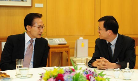 《經(jīng)濟參考報》記者13日上午與韓國《每日經(jīng)濟新聞》等5家媒體在韓國總統(tǒng)府青瓦臺聯(lián)合采訪了韓國總統(tǒng)李明博。李明博指出,中韓建交短短20年,兩國關(guān)系發(fā)展速度之快、合作之強前所未有。韓國政府愿積極推動韓中日自由貿(mào)易協(xié)定(FTA),希望在世界經(jīng)濟面臨困難時,對主要國家經(jīng)濟發(fā)揮積極的作用。