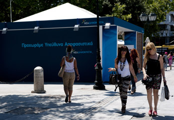 希臘首都雅典,民眾走過(guò)新民主黨選舉工作站。希臘將于6月17日舉行一個(gè)半月之內(nèi)的第二次議會(huì)選舉。這次選舉將在很大程度上決定希臘在歐元區(qū)的去留,乃至關(guān)系到整個(gè)歐元區(qū)的前途。記者