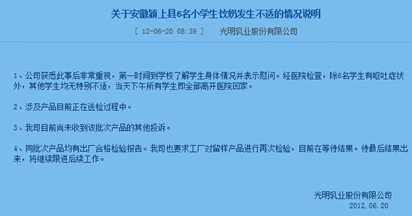6月20日,安徽潁上縣政府發(fā)布公告,當(dāng)?shù)匦录?zhèn)曹元、腰樓小學(xué)兩所學(xué)校的學(xué)生食用了營養(yǎng)餐后,部分學(xué)生出現(xiàn)不適癥狀。據(jù)悉,這兩所學(xué)校學(xué)生食用的是光明乳業(yè)企業(yè)配送的2012年6月2日生產(chǎn)批次的牛奶,該批次牛奶一共543件10860盒,當(dāng)天新集鎮(zhèn)共發(fā)放115件,2300盒。當(dāng)天傍晚前,身體不適的學(xué)生已全部返校。