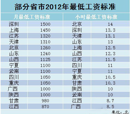 從2012年1月1日起到6月21日,北京、四川、江西、陜西、深圳、山東、上海、天津、廣西、寧夏、甘肅、山西、云南、重慶、江蘇這15個省市先后調(diào)整了最低工資標(biāo)準(zhǔn)。